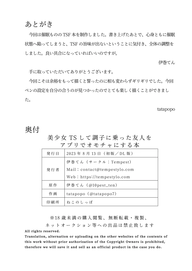 (C102) [Tempest (tatapopo、伊巻てん)] 美少女TSして調子に乗った友人をアプリでオモチャにする本 (オリジナル) [DL版]スポンサーリンクXコピー2024.05.12オリジナルtatapopo、伊巻てんTempestスポンサーリンク